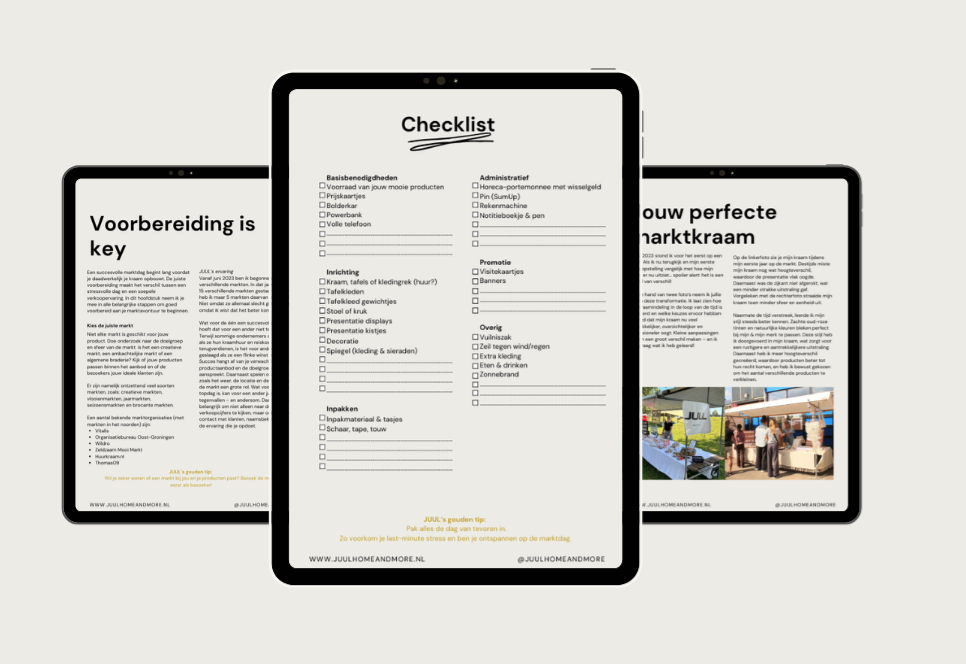 Verkopen op markten is leuk, maar kan ook een uitdaging zijn. Hoe trek je klanten aan? Hoe zorg je voor een aantrekkelijke kraam? In deze mini-cursus deel ik – Julia van JUUL home & more – mijn ervaring na 40+ markten en geef ik je praktische tips om meer te verkopen.
