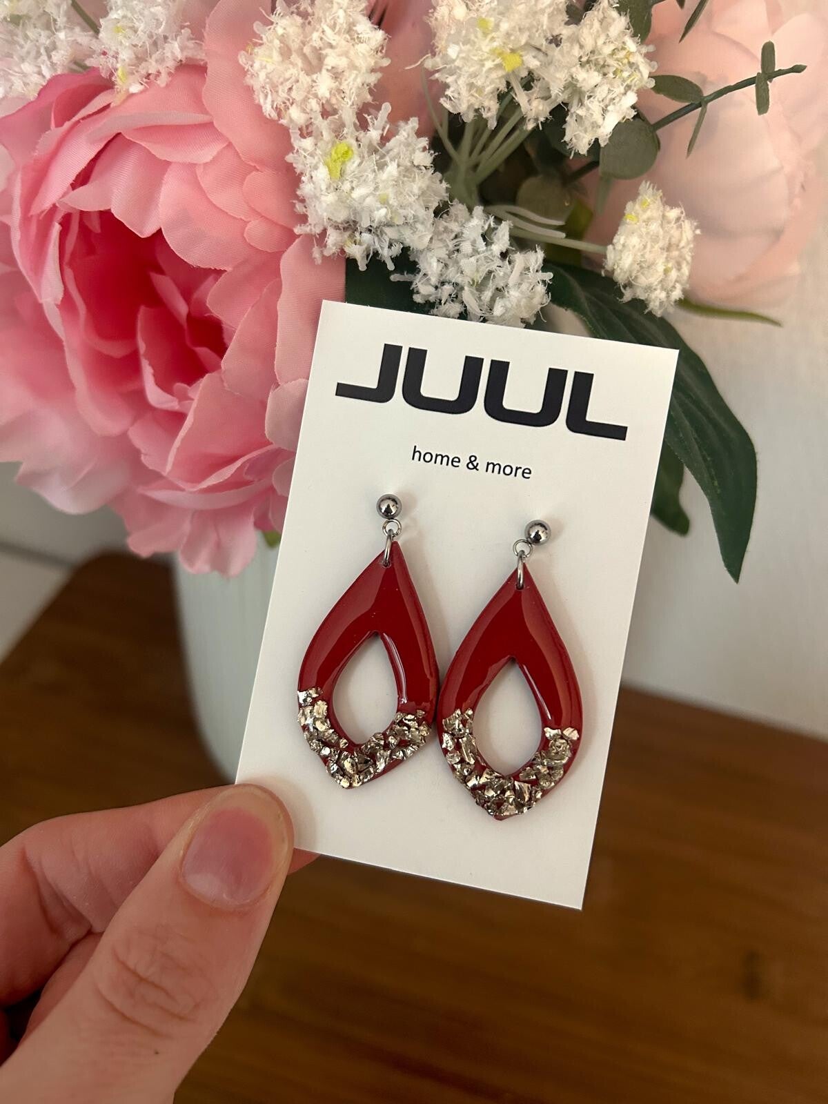De oorbellen zijn afgewerkt met een laagje resin. Bewaar ze daarom apart van scherpe voorwerpen om krassen te voorkomen. Maak de oorbellen schoon met een licht vochtig doekje. Gebruik geen alcohol of andere chemische middelen, want die kunnen de resin dof maken.